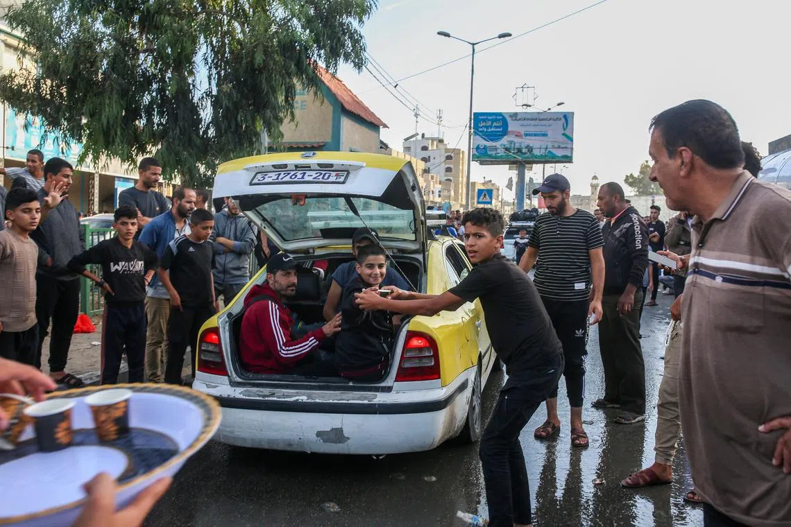 Residents of Khan Younis welcoming displaced people from Gaza City with water and food.