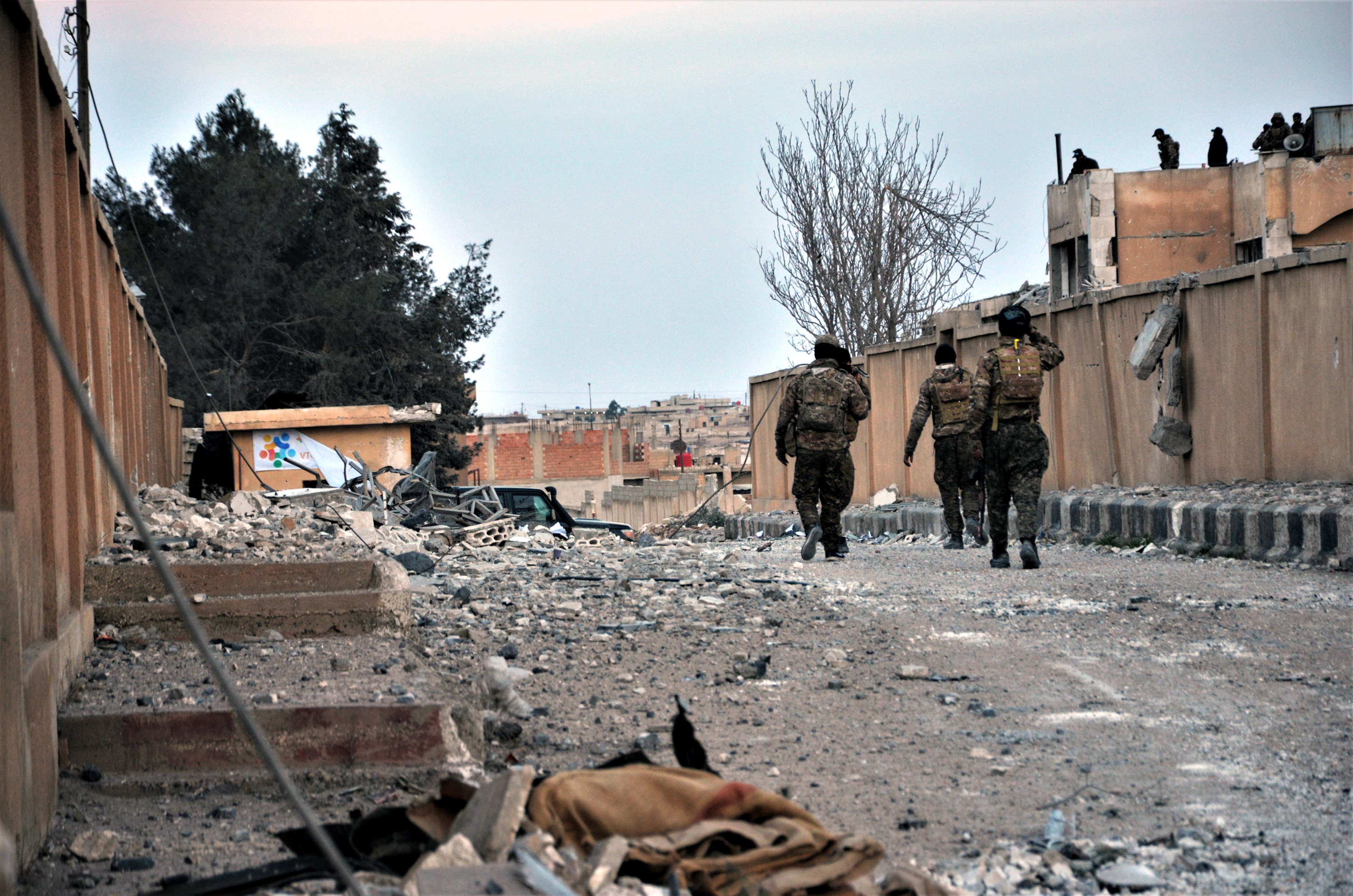 SDF fighters walk amid the damage around the makeshift Ghwayran prison, on Jan 26, 2022.