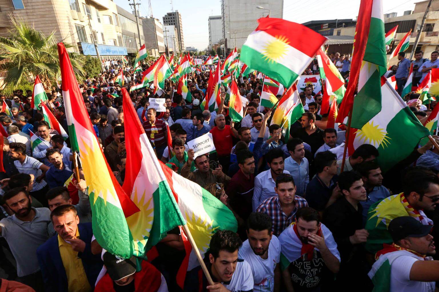 Iraqi Kurds wave flags of Iraqi Kurdistan and shout slogans during a demonstration outside the UN Office in Arbil on Oct 21, 2017.