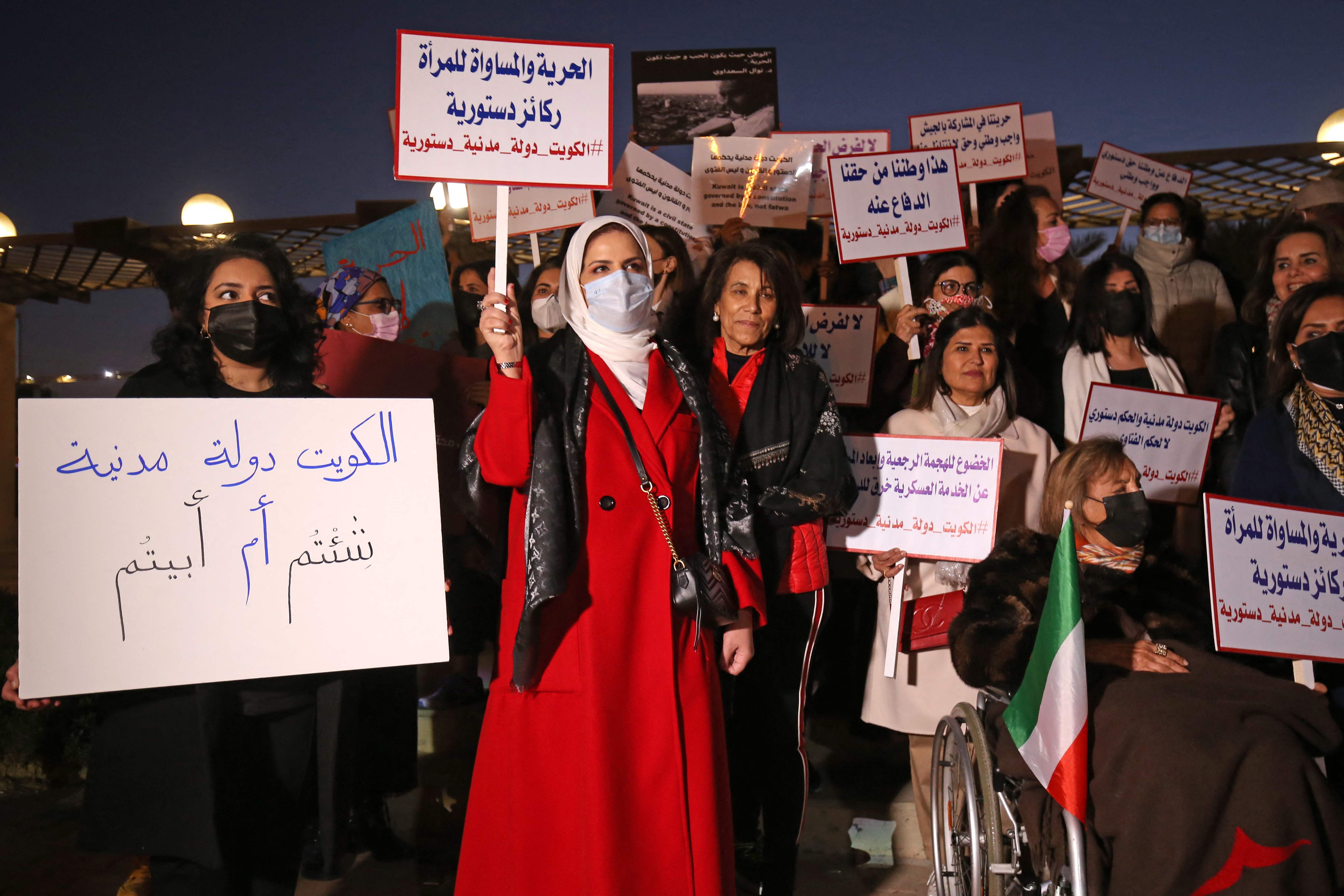 Kuwaiti women protesting in Kuwait City on Feb 7, 2022, in support of their right to exercise activities.