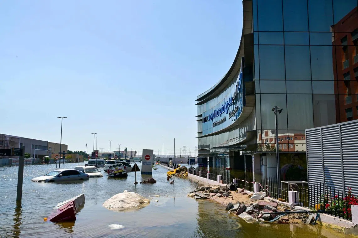 Cars stranded on flooded streets in Dubai following heavy rains on April 19.