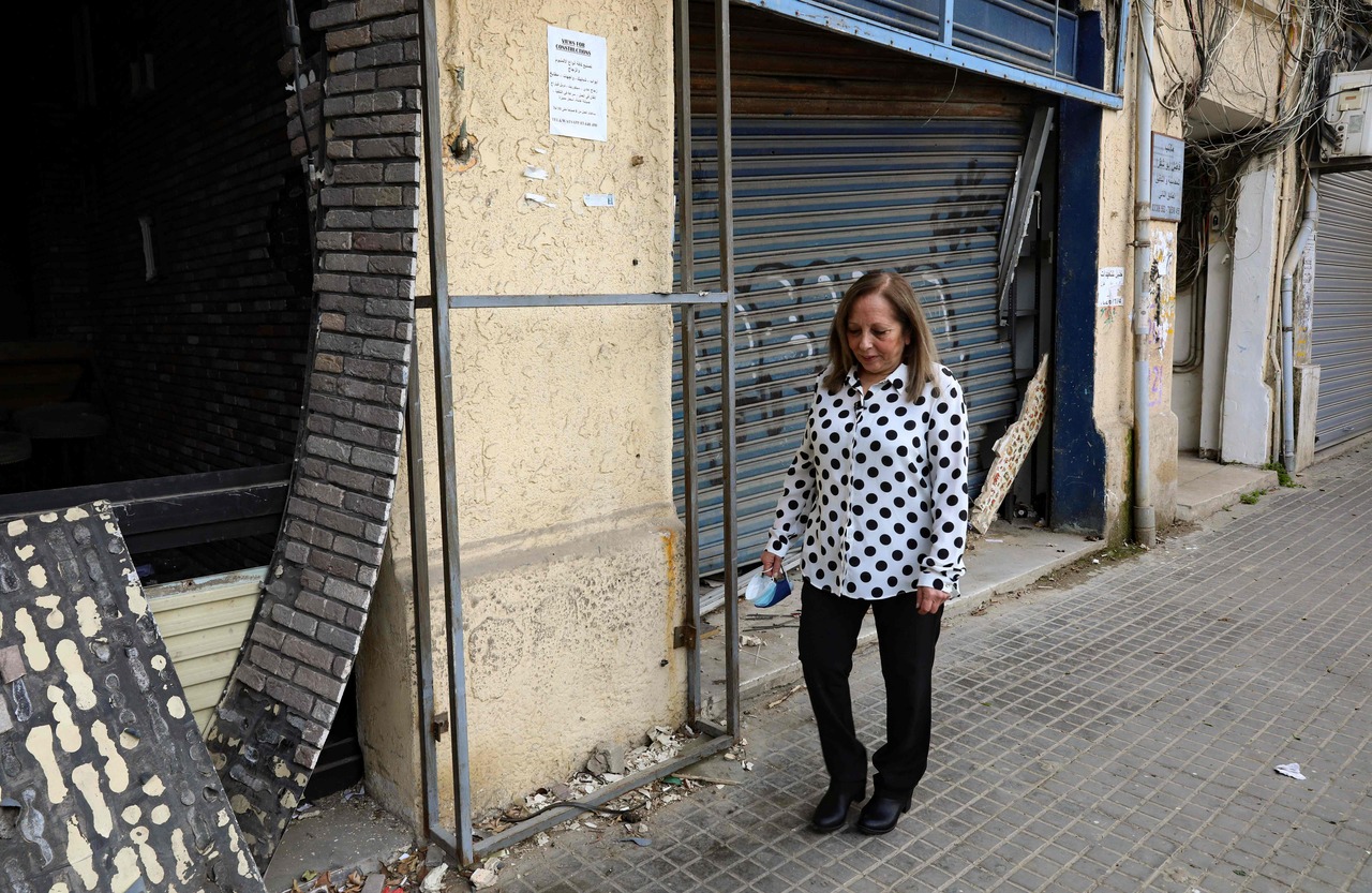 Civil war survivor Abla Barotta on April 6, 2021, walking in front of shops damaged by the Aug 4, 2020, port explosion in Beirut.