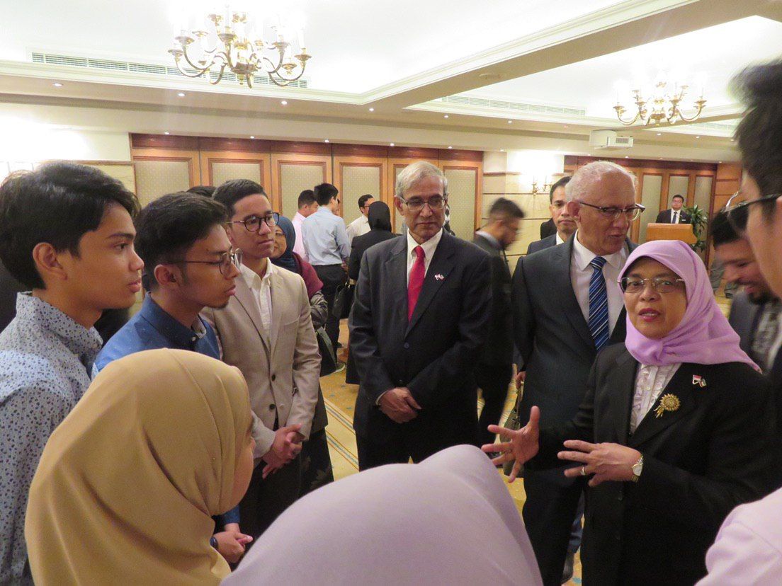President Halimah Yacob chatting with students during the reception, accompanied by her husband Mr Mohamed Abdullah Alhabshee (in blue tie) and Mr Zainul Abidin Rasheed (red tie), Singapore’s non-resident ambassador to Kuwait.