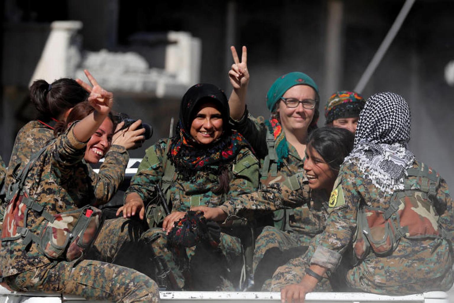 Female fighters from the Syrian Democratic Forces making the "V" sign in Raqqa on Oct 18, 2017.