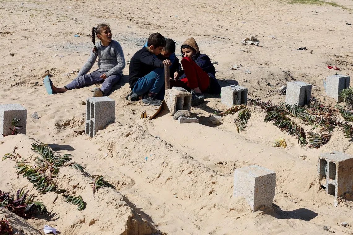 Displaced Palestinian children, who fled their houses due to Israeli strikes, play in a cemetery where they shelter, in Rafah, southern Gaza Strip, on Feb 5.
