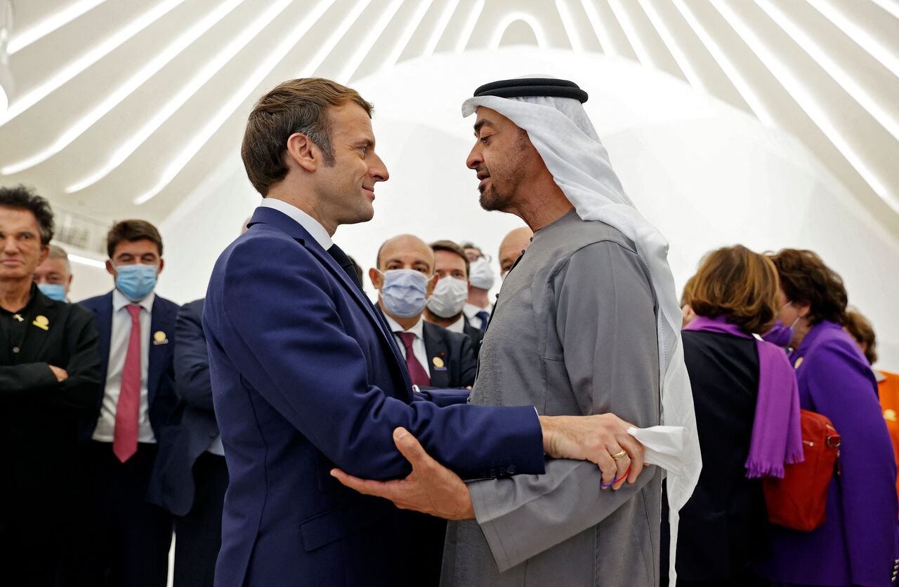 French President Emmanuel Macron (left) is greeted by Abu Dhabi's Crown Prince Mohammed bin Zayed al-Nahyan at the Dubai Expo on the first day of his Gulf tour on Dec 3, 2021.