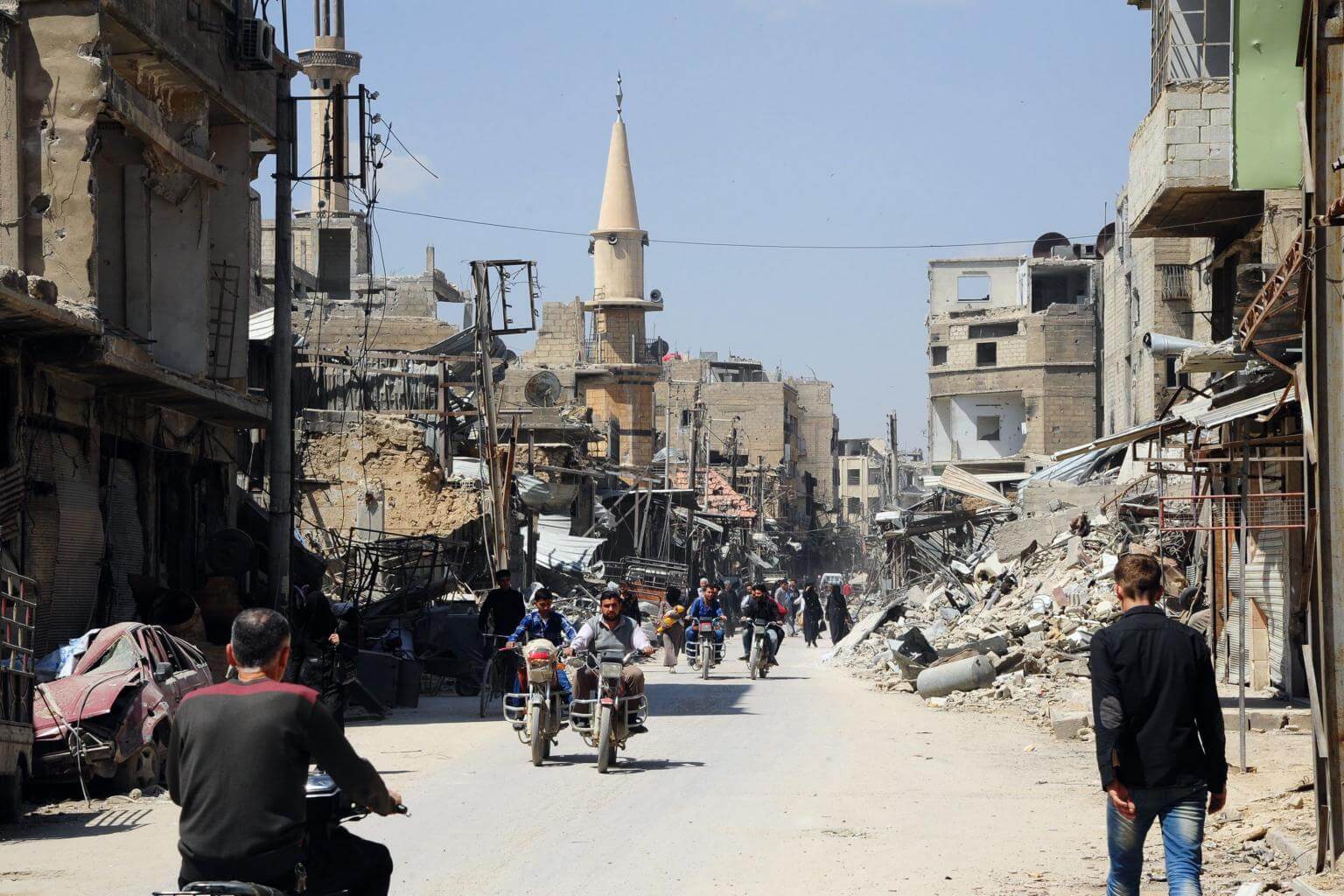 People walking down a street in the Eastern Ghouta town of Douma on April 14, 2018, after Syrian government forces entered the last rebel bastion.