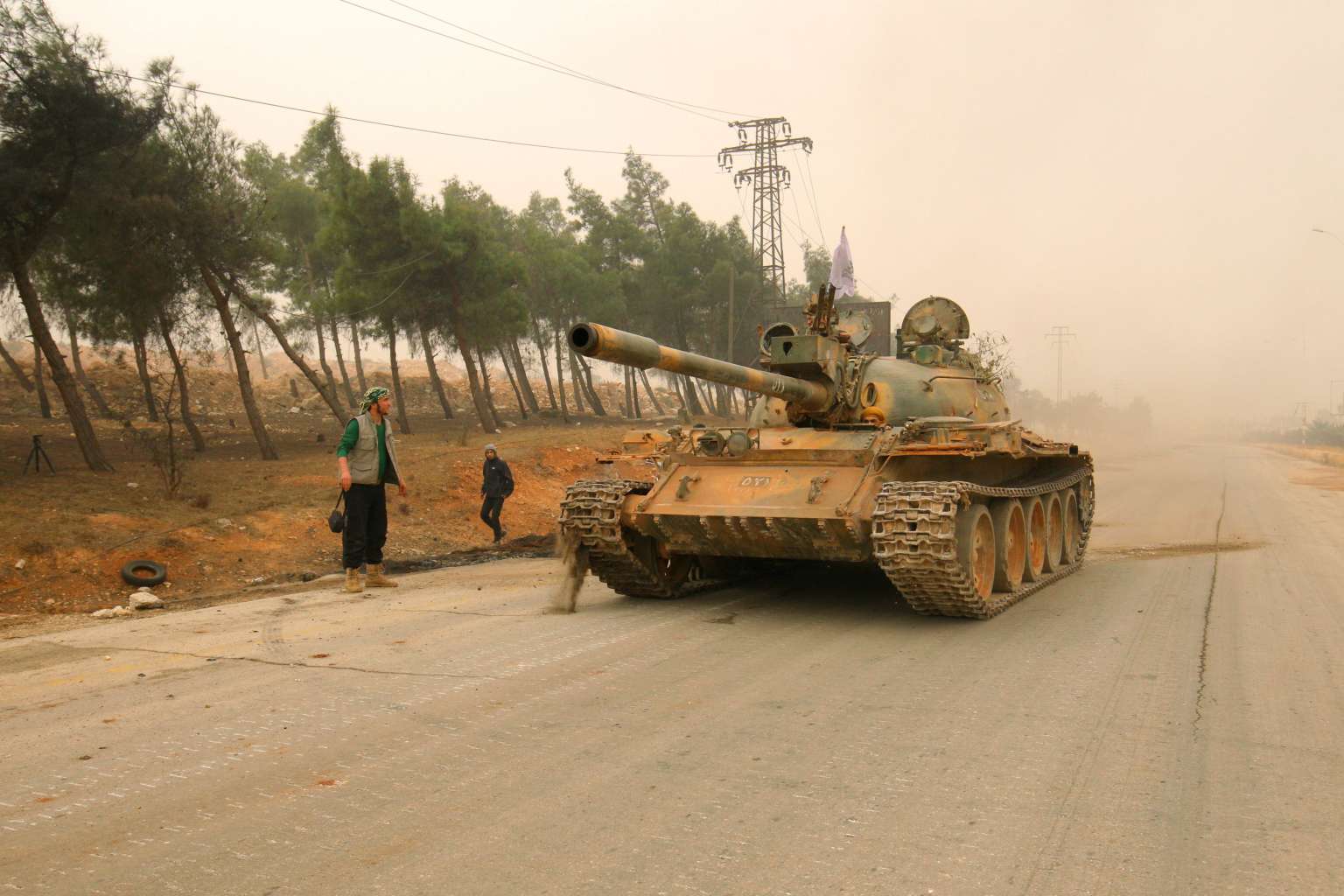 A tank for rebel fighters drives in Dahiyat al-Assad west Aleppo city, Syria on Oct 28, 2016.