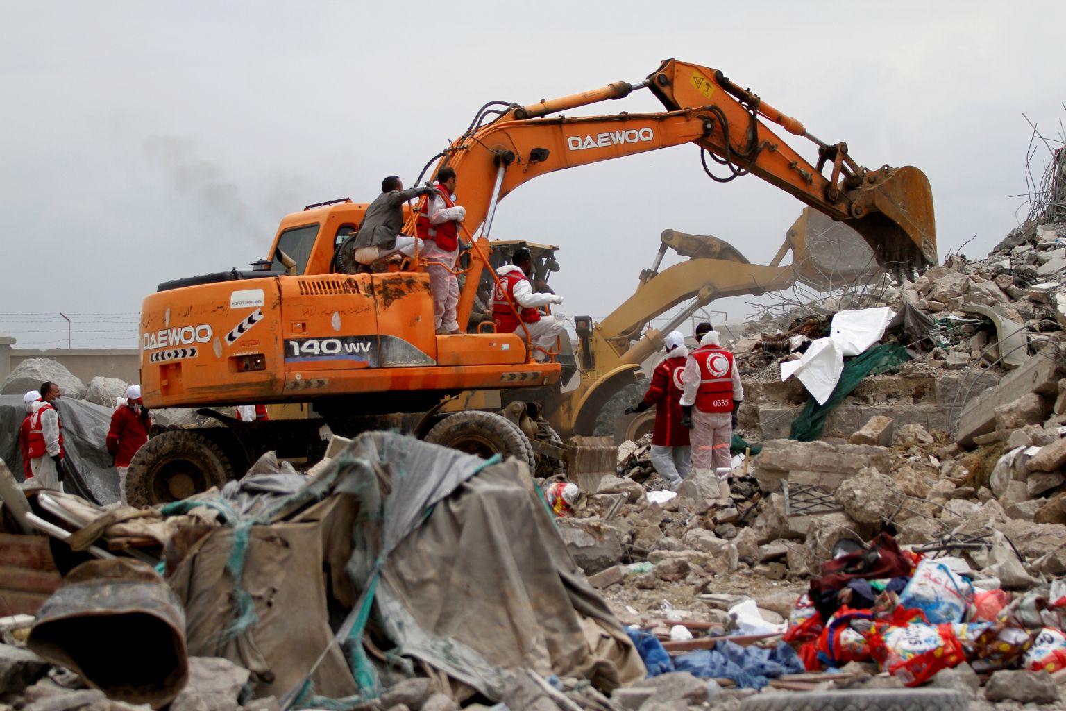 Red Crescent medics look on as an excavator is used to dig through rubble to search for bodies at the site of Saudi-led air strikes on a Houthi detention centre in Dhamar, Yemen.