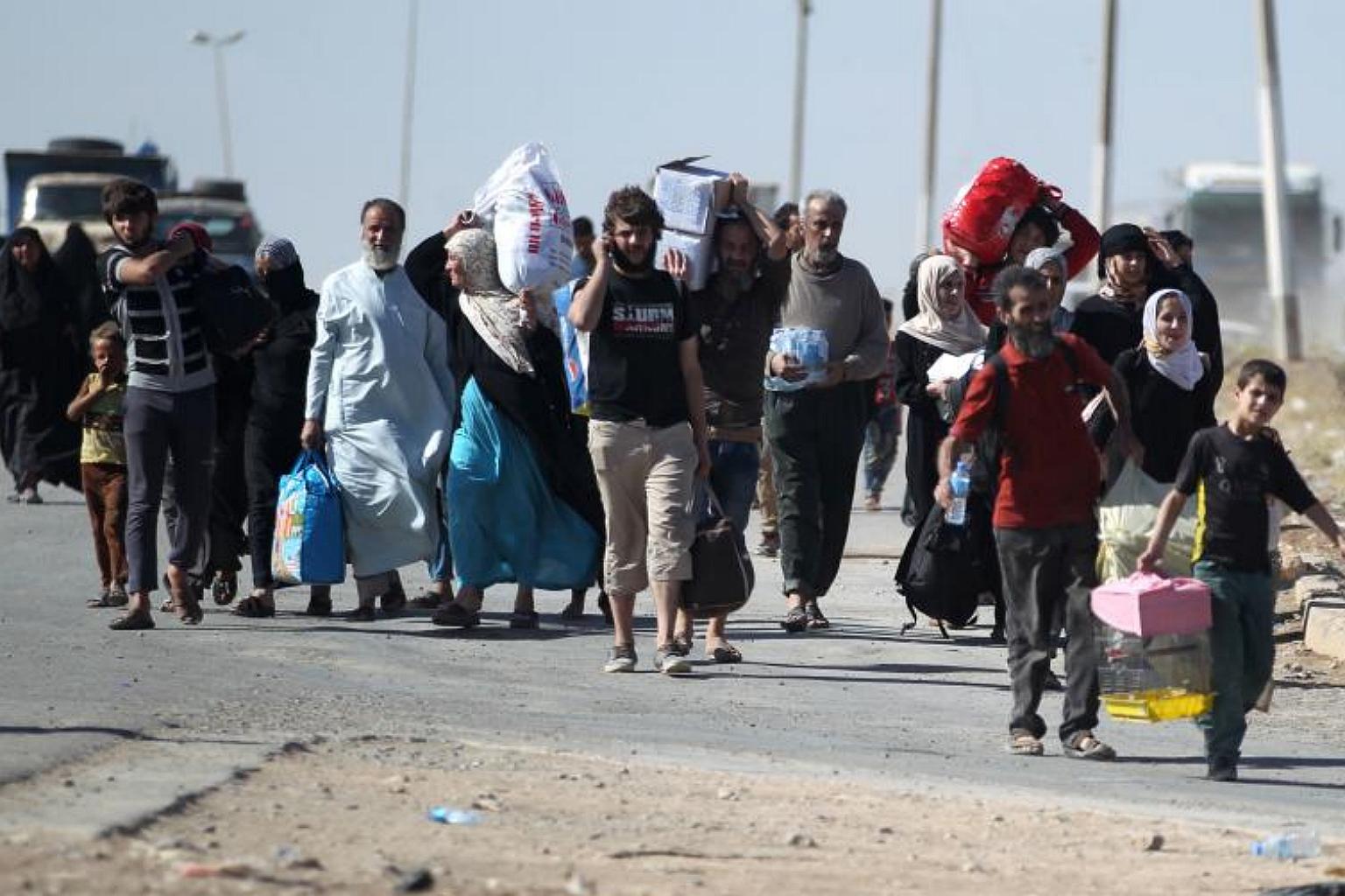Displaced Iraqis from western Mosul heading to a camp for internally displaced people after they fled their homes on May 20, 2017, as Iraqi forces advanced in their offensive against the Islamic State in Iraq and Syria group.