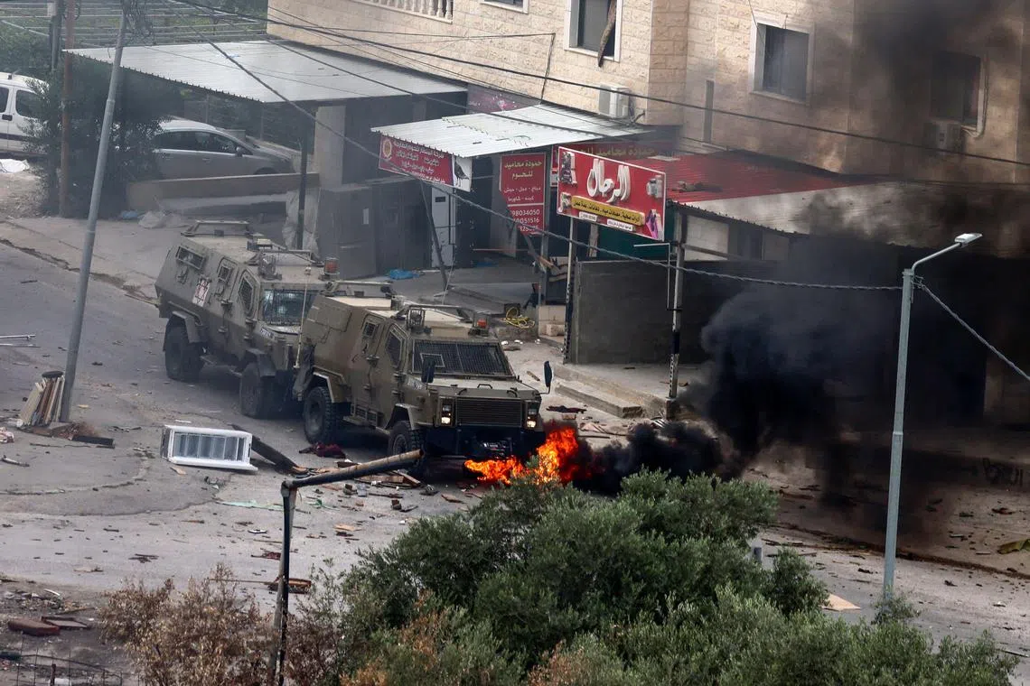Tyres burn beneath Israeli security forces’ armoured vehicles during a raid in Jenin in the occupied West Bank.