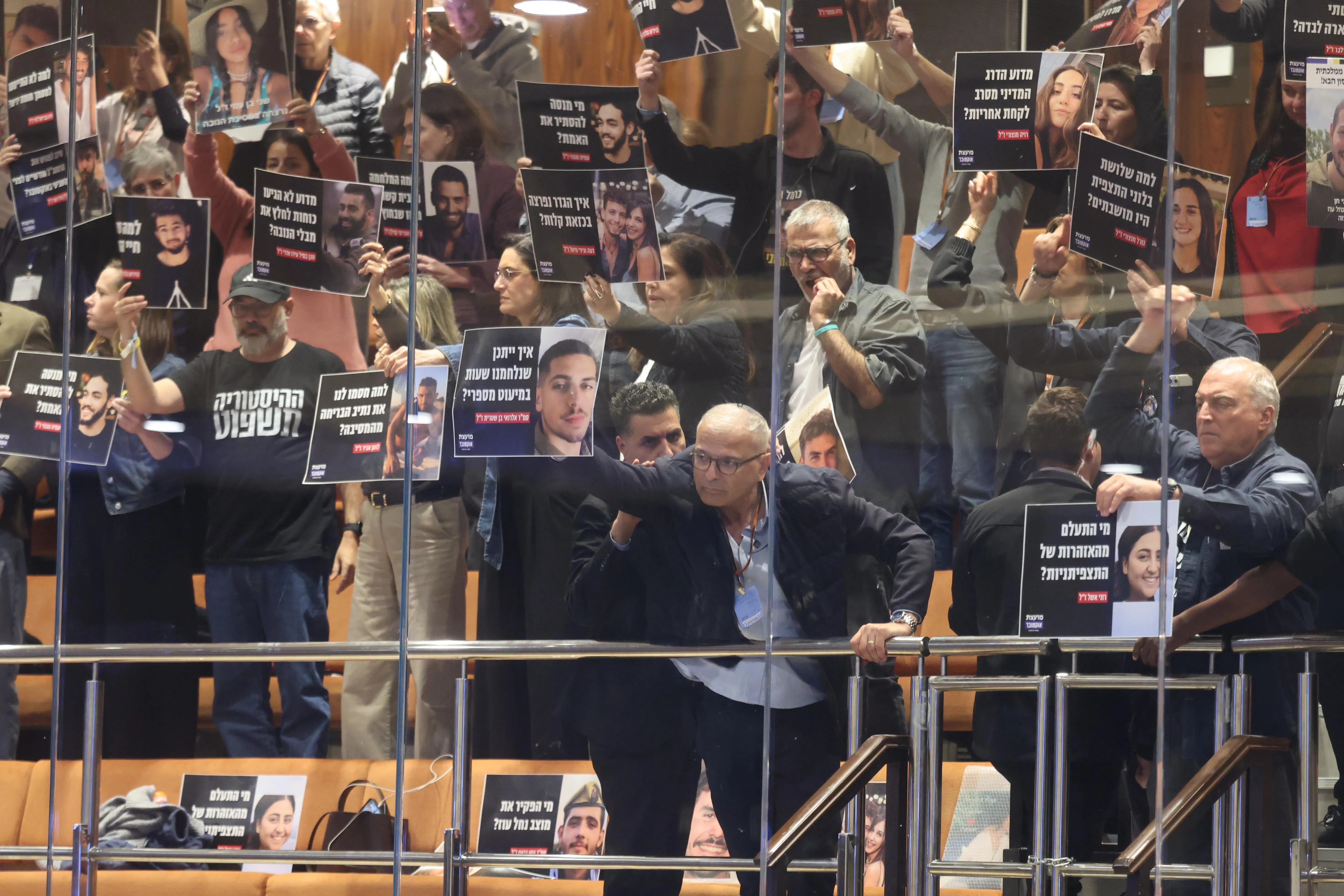 Bereaved family members holding pictures of their loved ones and shouting slogans towards Knesset members during a debate on the Oct 7 investigation Bill on Dec 24.
