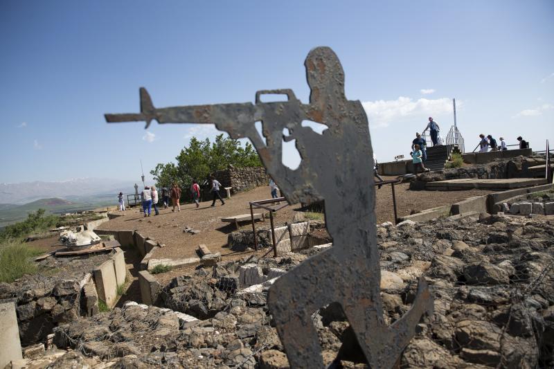 Tourists walk past the statue of an Israeli soldier next to the Israeli-Syrian border in the Golan Heights on April 14, 2018.
