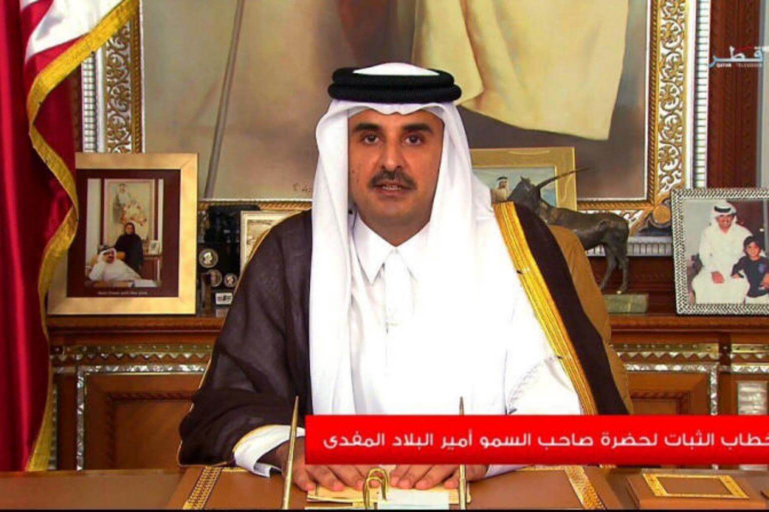 Emir of Qatar Sheikh Tamim bin Hamad al-Thani delivers a televised speech in Doha, on July 21, 2017.