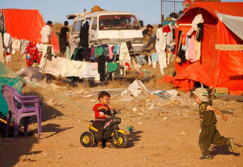Displaced Syrian children from the Daraa province fleeing shelling by pro-government forces wait in a makeshift camp to cross the Jordanian border on July 1, 2018.