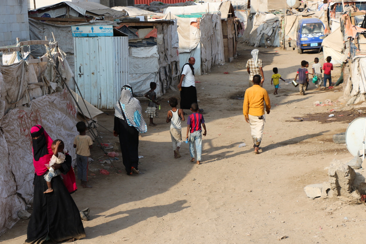 People walking through a makeshift camp for refugees in Aden, Yemen, on March 15, 2022.