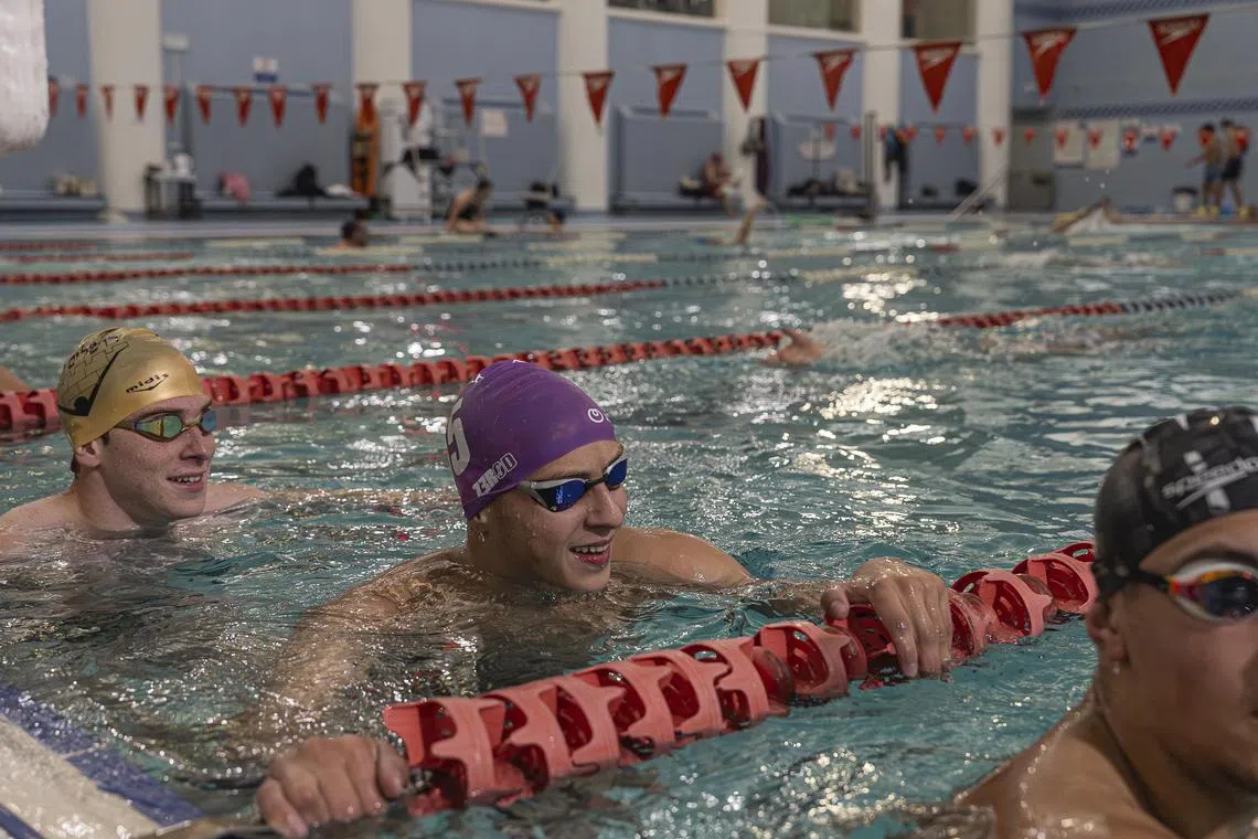 Alex Finkel (left) and Mustafa Abdu, swimmers with the Greater Jerusalem swim club, resting after a drill at a YMCA pool in Jerusalem on Nov 5, 2023.