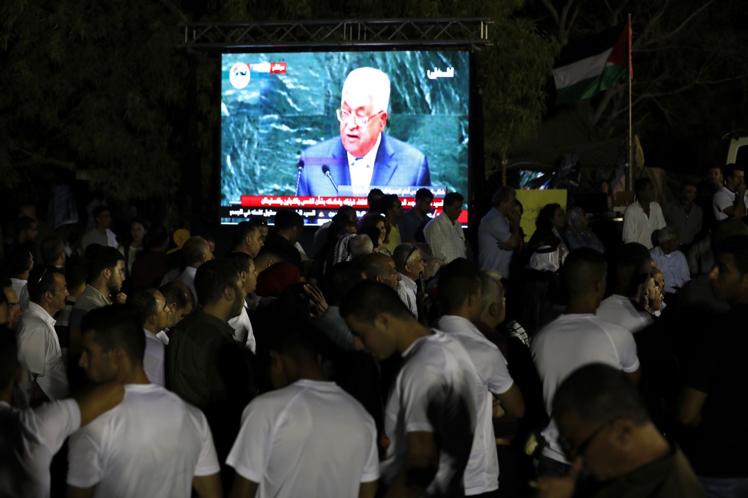 Palestinians watch as Mahmoud Abbas addresses the UN General Assembly.