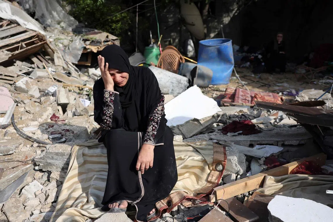 A woman sits amid the rubble of her house at Nusseirat refugee camp in Gaza on Sunday.