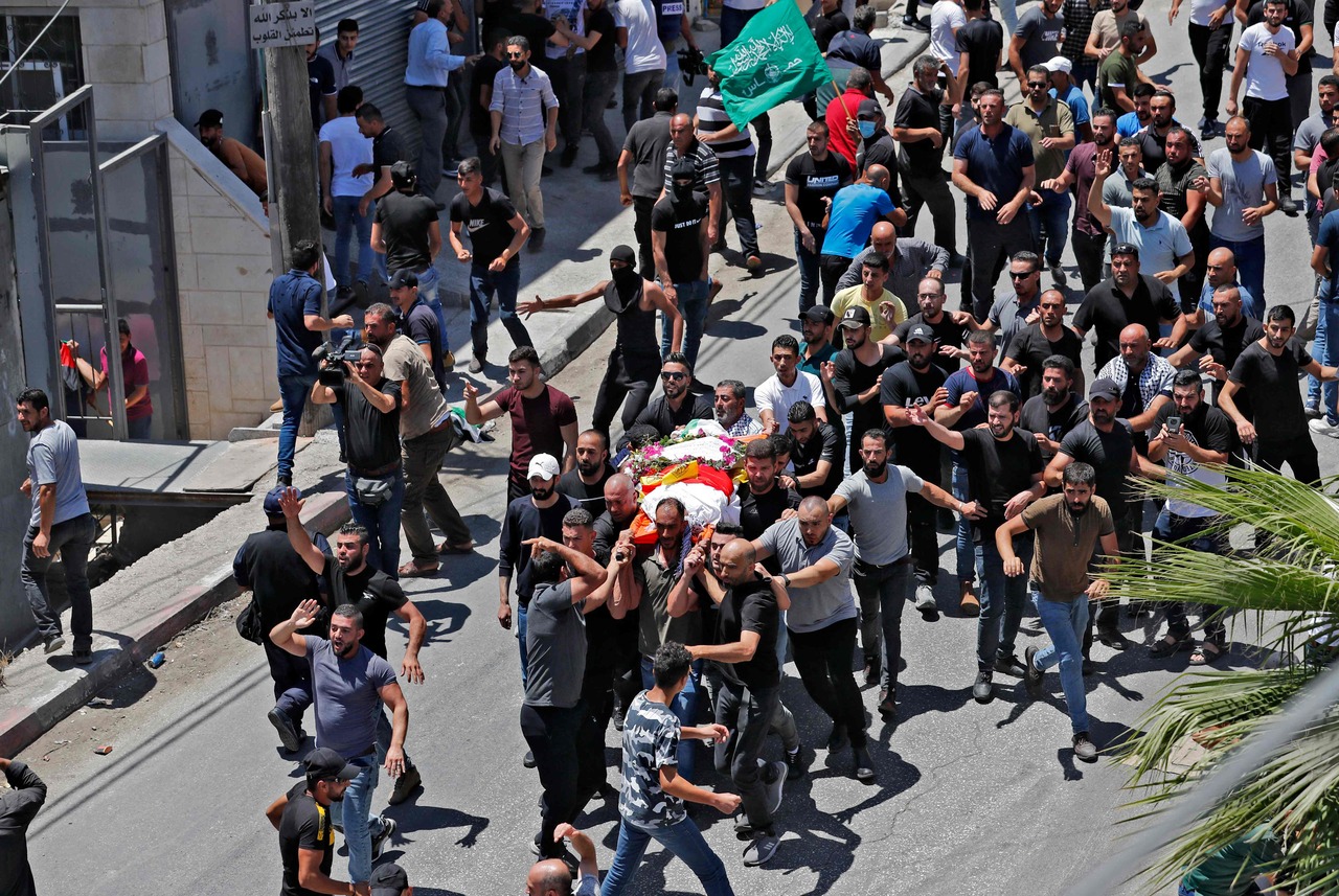 People are seen during a funeral procession for Mohamad al-Alami, who died after being shot by Israeli soldiers, on July 29, 2021.