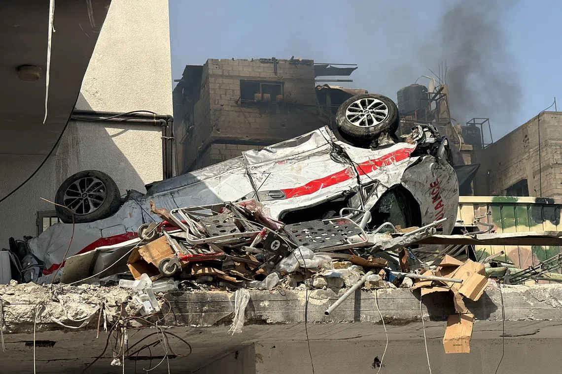 The damage to an ambulance at the Kamal Adwan Hospital in Beit Lahia the northern Gaza Strip on Oct 26.