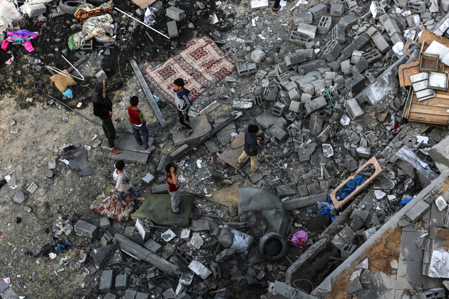 Palestinian children gathering among the rubble of a building that was destroyed during Israeli air strikes on Gaza City.