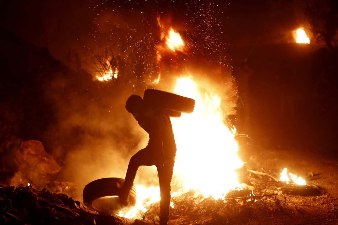 A Palestinian demonstrator setting a tyre on fire during a night protest against settlers in Beita, in the West Bank, on June 22, 2021.