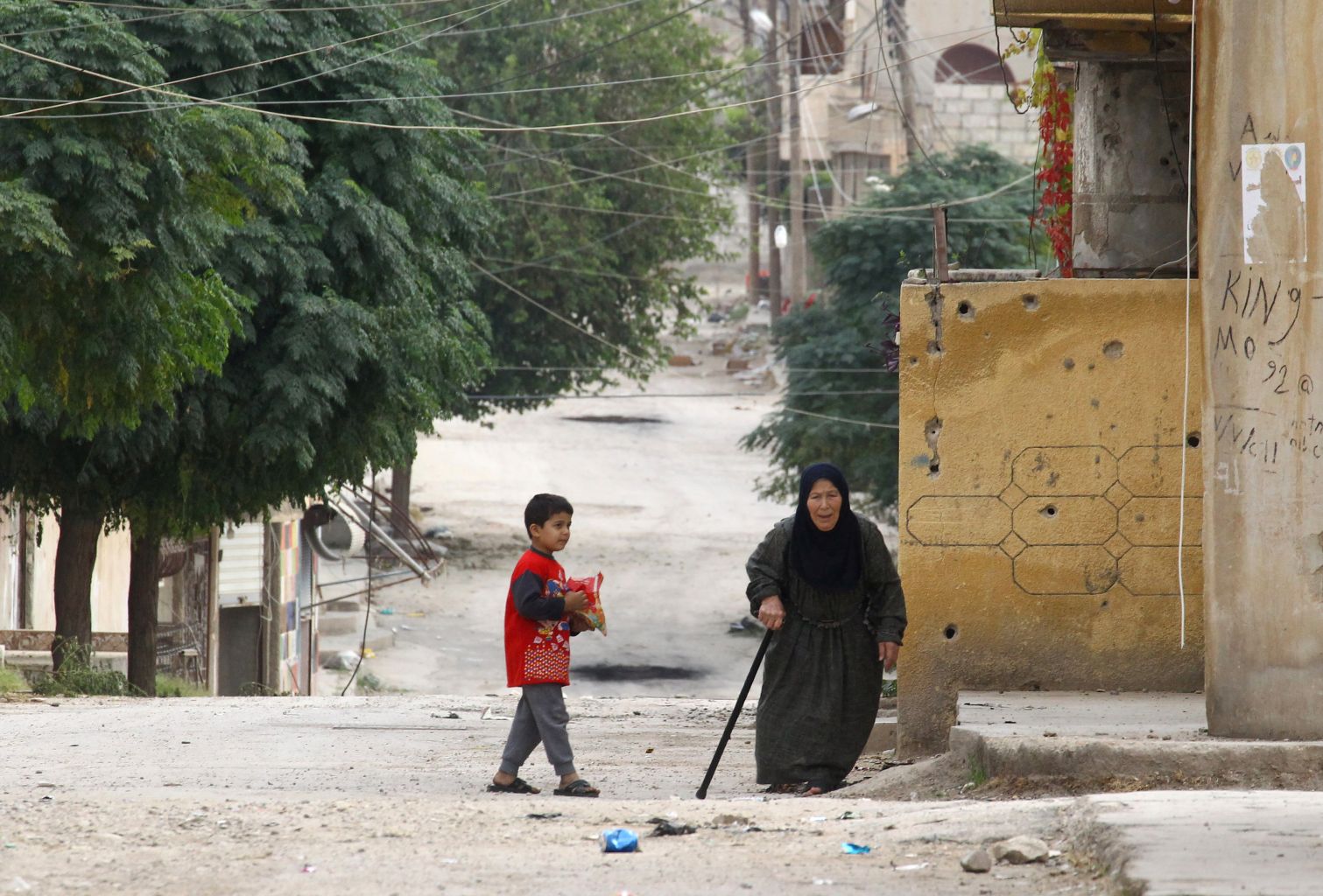 An elderly woman and a child are seen on a deserted street in the town of Ras al-Ain, Syria, Oct 24, 2019.