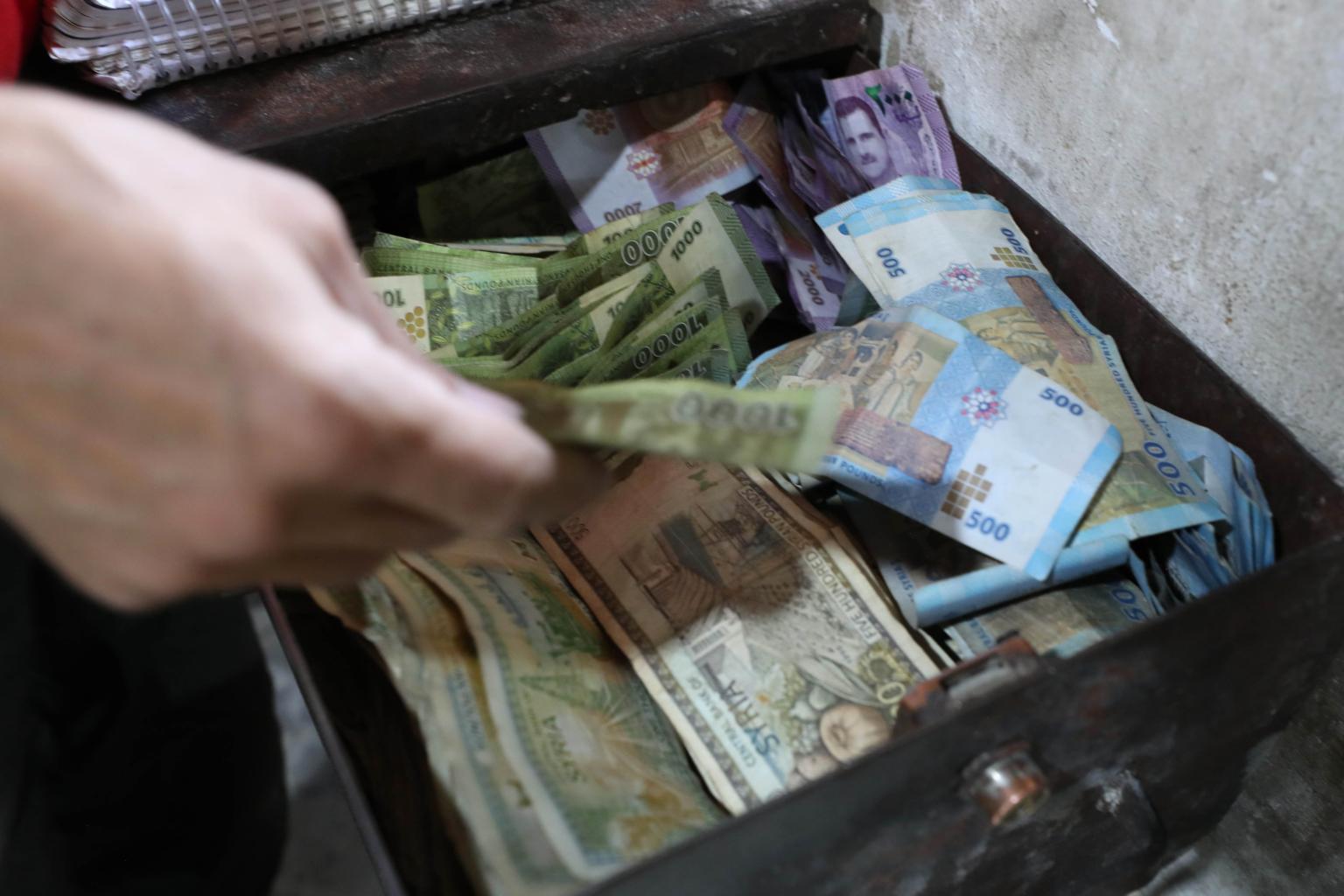 A merchant displays Syrian pounds notes at a shop in the town of Binnish in Syria's northwestern Idlib province, on June 9, 2020.
