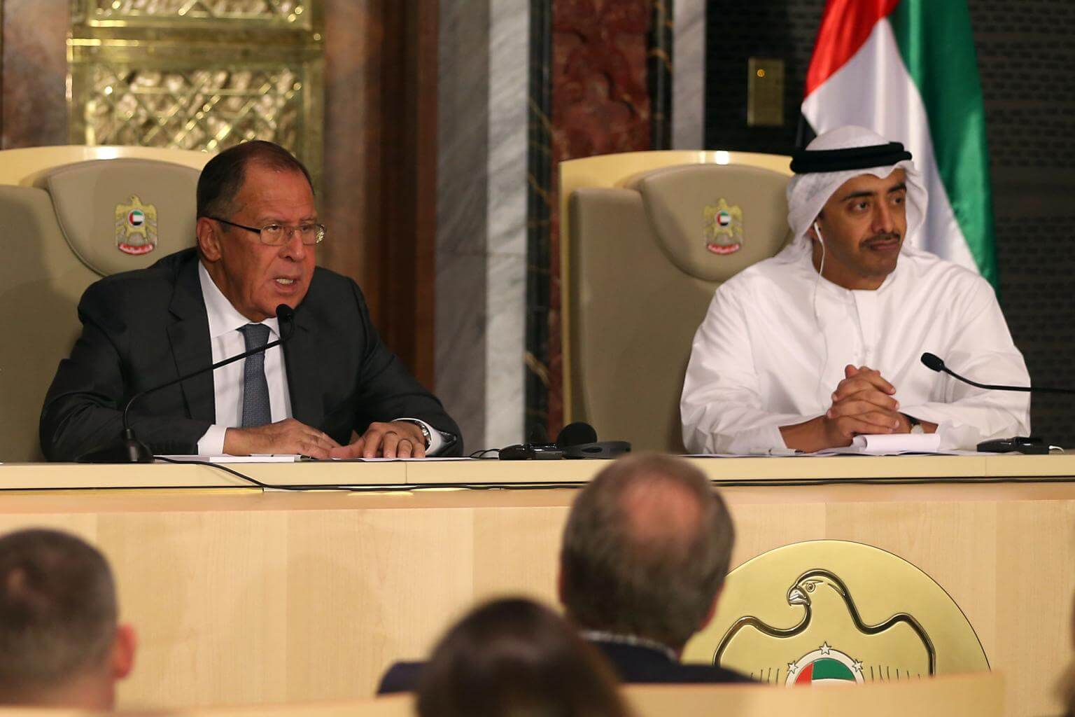 Russia's Foreign Minister Sergei Lavrov (left) and UAE's Minister of Foreign Affairs and International Cooperation Abdullah bin Zayed Al-Nahyan give a press conference in Abu Dhabi on Aug 29, 2017.