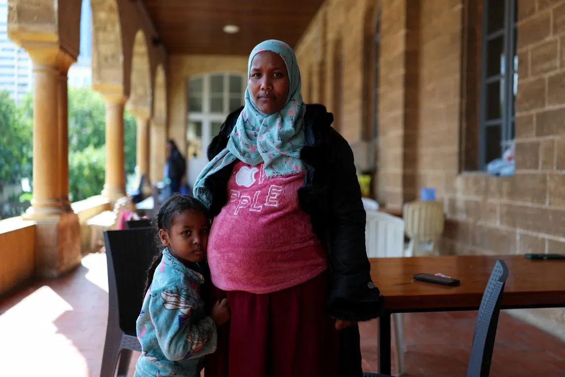 Refugee Ridina Muhammad, 32, eight months pregnant with her fourth child, and her daughter Talia, 5, originally from Khartoum, Sudan, at the St Joseph Church in Beirut.