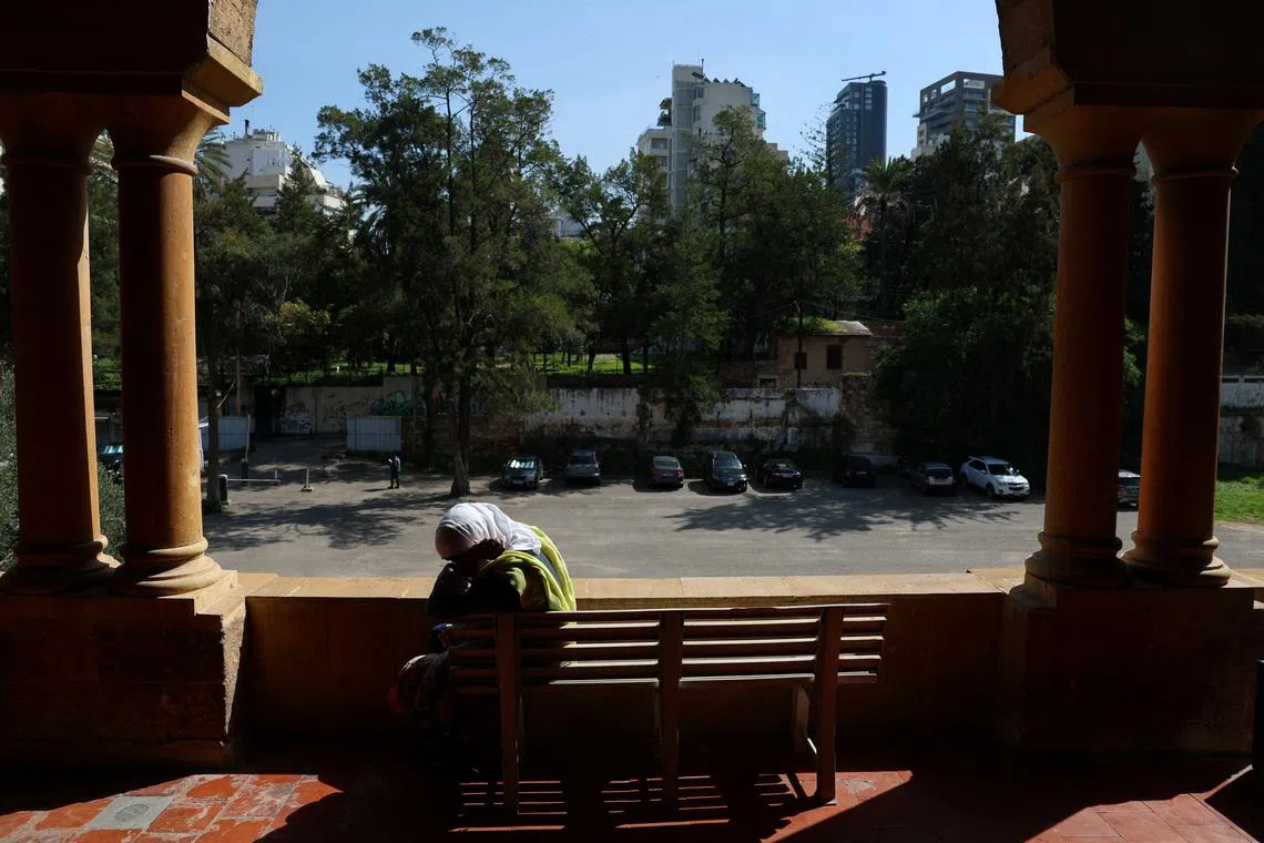 A woman sits as refugees and displaced migrant workers shelter in St Joseph Church, following an escalation between Hezbollah and Israel amid the US-Israeli conflict with Iran.