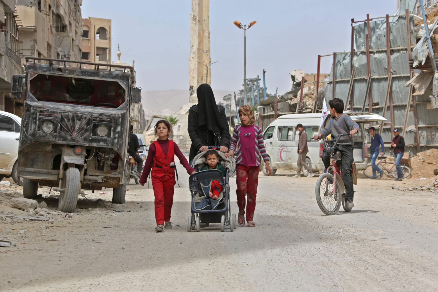 Civilians walking in the former Syrian town of Douma on the outskirts of Damascus on April 17, 2018.