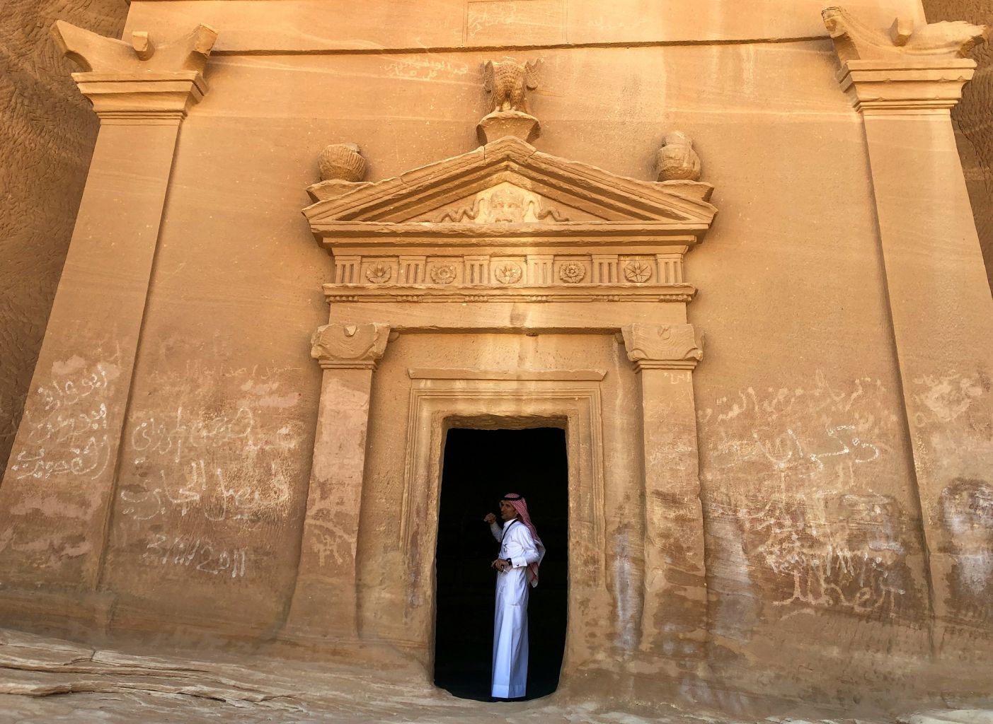 A Saudi tour guide stands inside a tomb at the Madain Saleh antiquities site, al-Ula, Saudi Arabia.