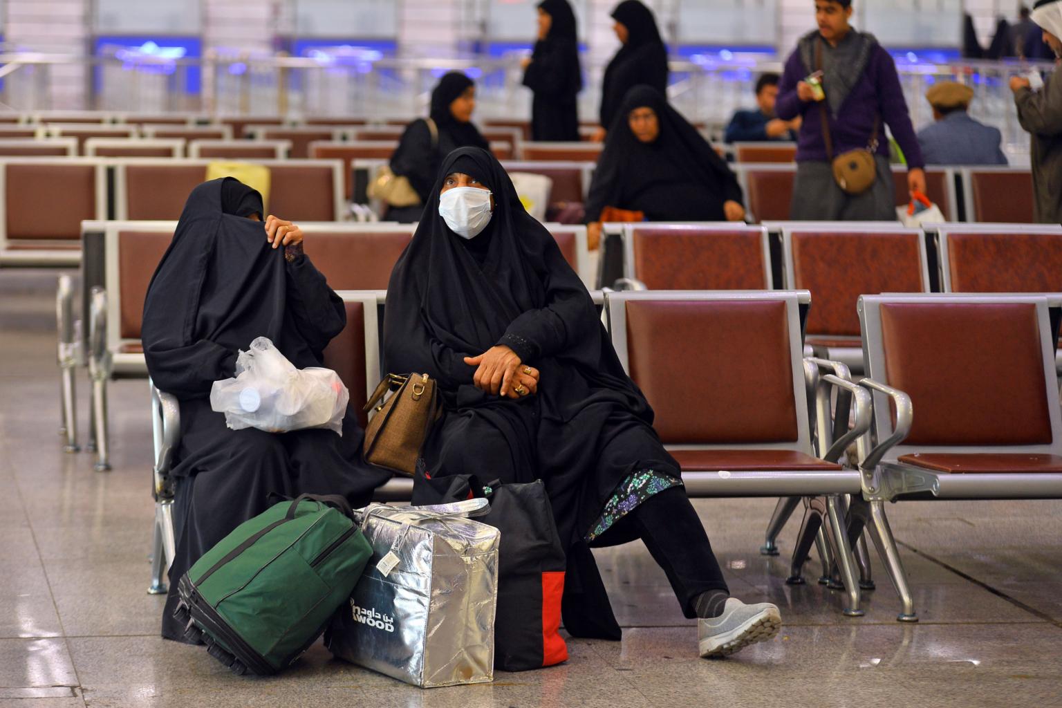 Iraqis returning from Iran wear protective masks upon their arrival at the Najaf International Airport on Feb 21, 2020.