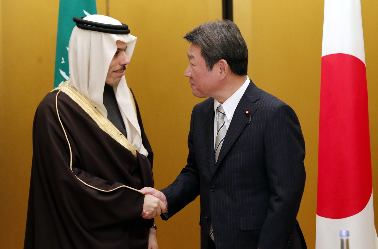 Saudi Arabia's Prince Faisal bin Farhan al-Faisal and Japanese Foreign Minister Toshimitsu Motegi meet during the G-20 Foreign Ministers meeting in Nagoya, Japan, on Nov 22, 2019.