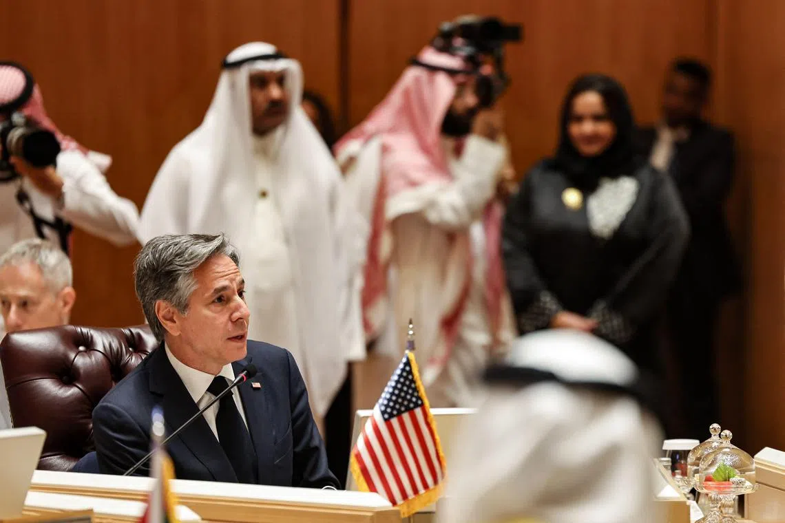 US Secretary of State Antony Blinken addressing Gulf Cooperation Council ministers at the GCC Secretariat in Riyadh.