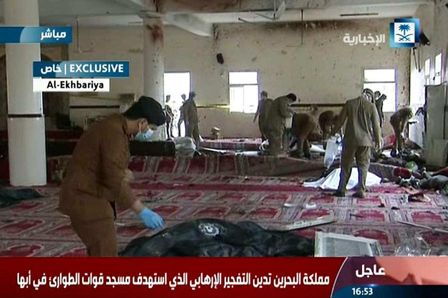Saudi security forces inspecting the site of a suicide bombing at a mosque in the city of Abha, in this image grab taken from Saudi Al-Ekhbaria TV on Aug 6, 2015.