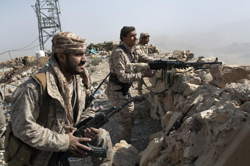 Yemeni fighters loyal to the Saudi-led coalition are seen at the frontline in Nehim, Yemen, on Jan 23, 2019.