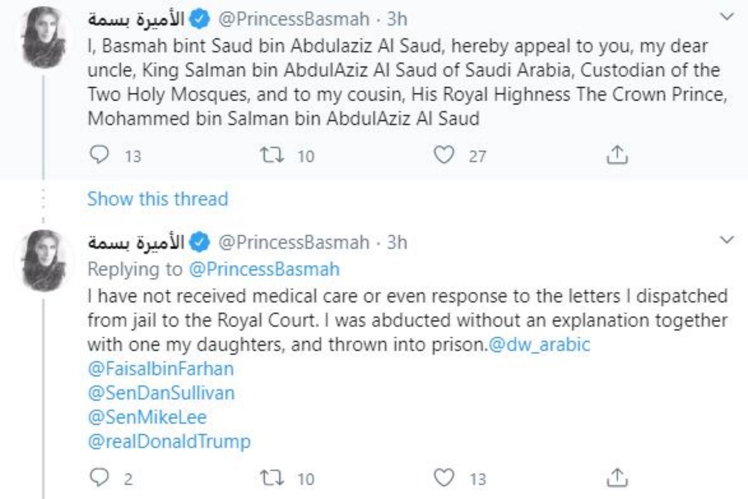 It was unclear how the princess was able to tweet from inside Al-Ha'ir, a high-security prison close to Riyadh known for holding political prisoners.