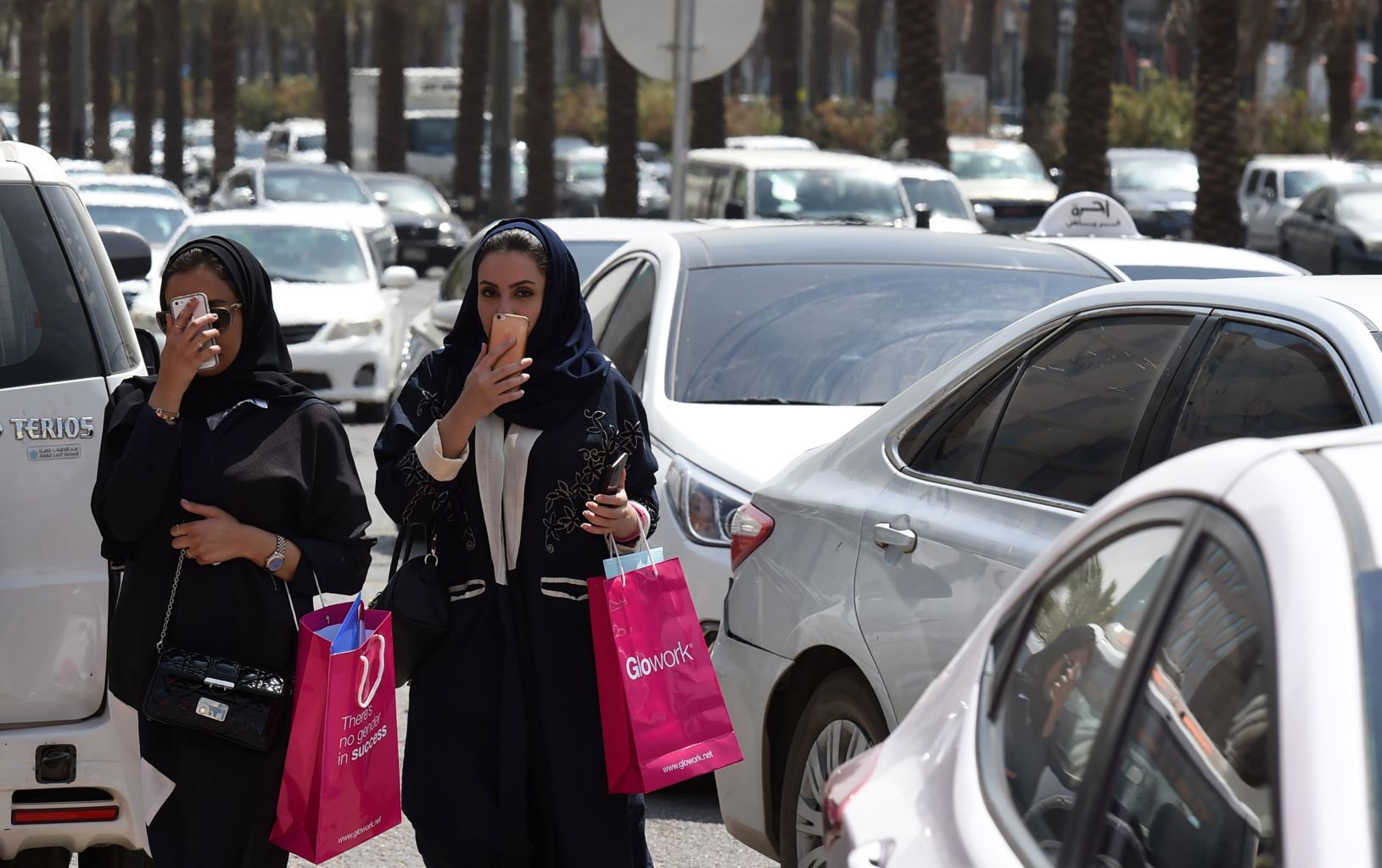 Saudi women walk amid vehicles in a street in the Saudi capital Riyadh, on Sept 28, 2017.