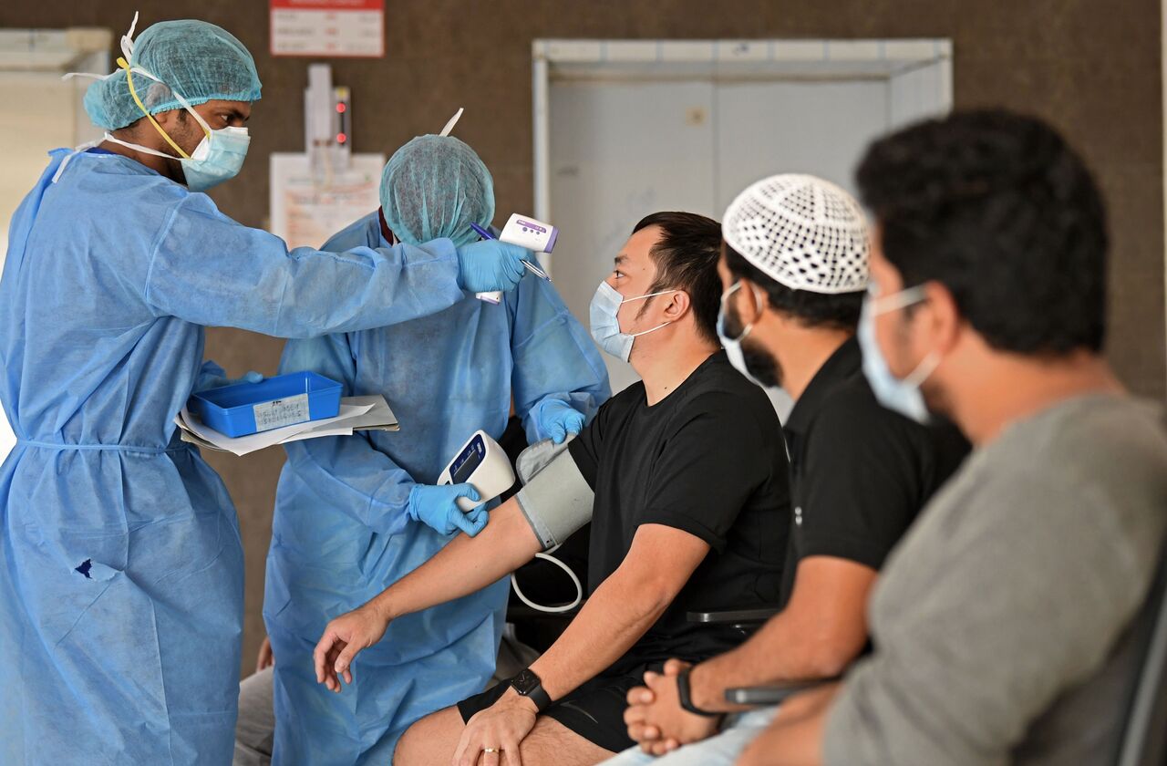 A health worker checks the temperature of a migrant worker who recovered from the coronavirus, in Dubai, on April 22, 2020.