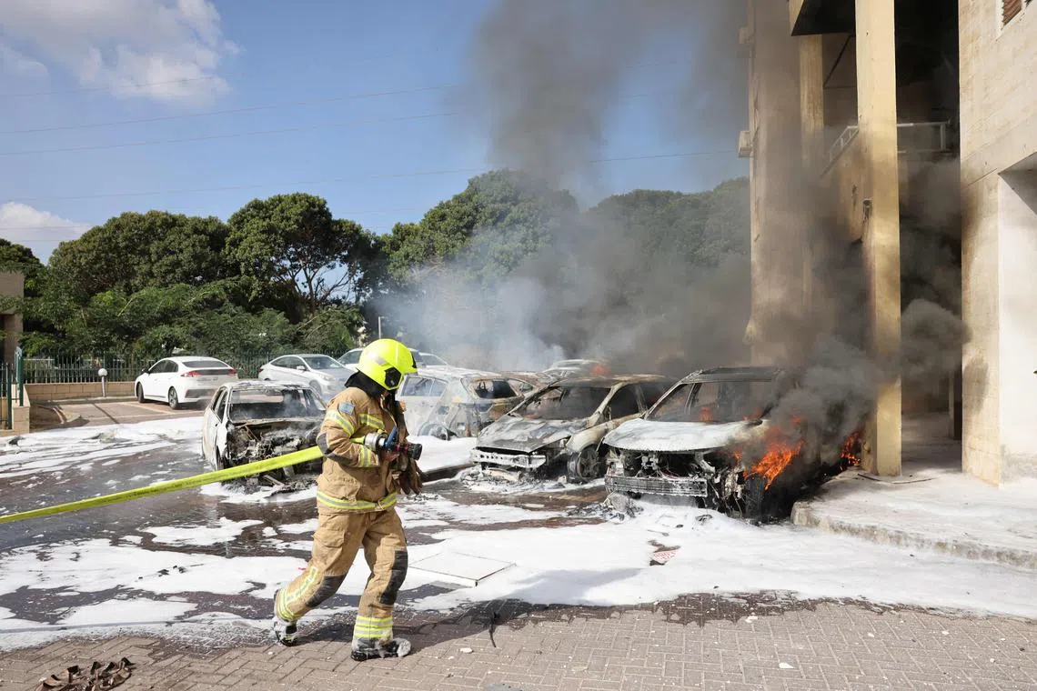 A firefighter putting out a fire following a rocket attack from Gaza on Ashkelon in southern Israel on Saturday.