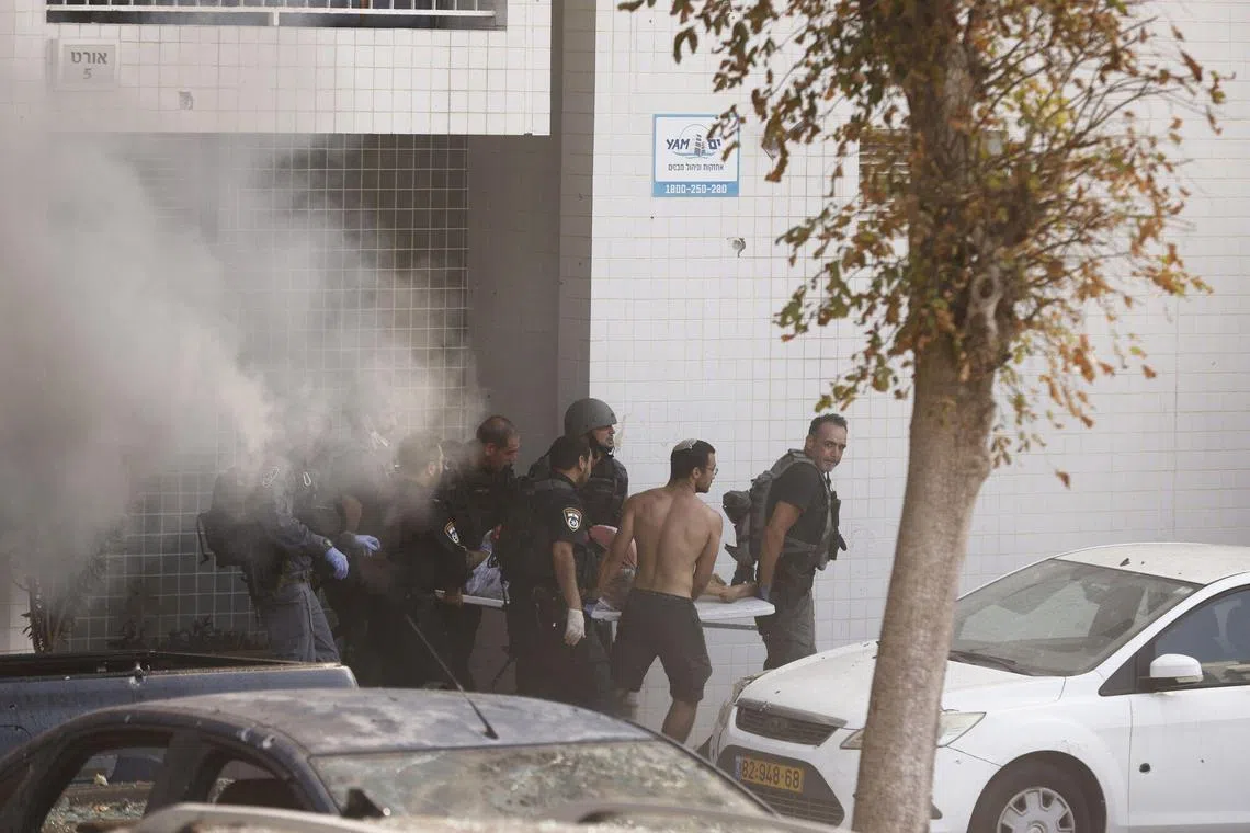 Residents and security forces carrying an injured person following a rocket attack in Ashqelon, Israel, on Saturday.