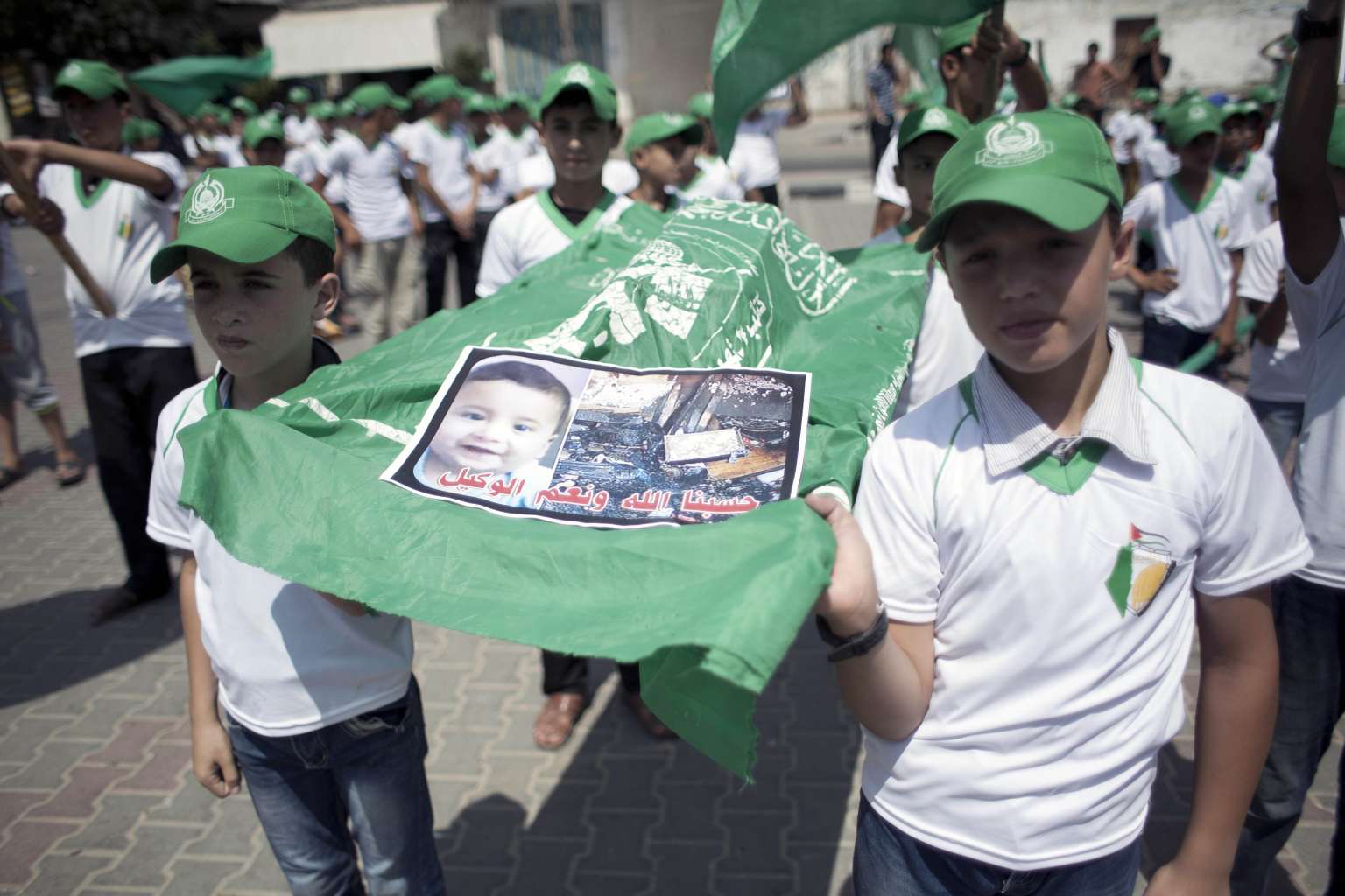 Palestinian children carry a funeral stretcher with a picture of 18-month-old Ali Saad Dawabsha, during a demonstration simulating a funeral ceremony.