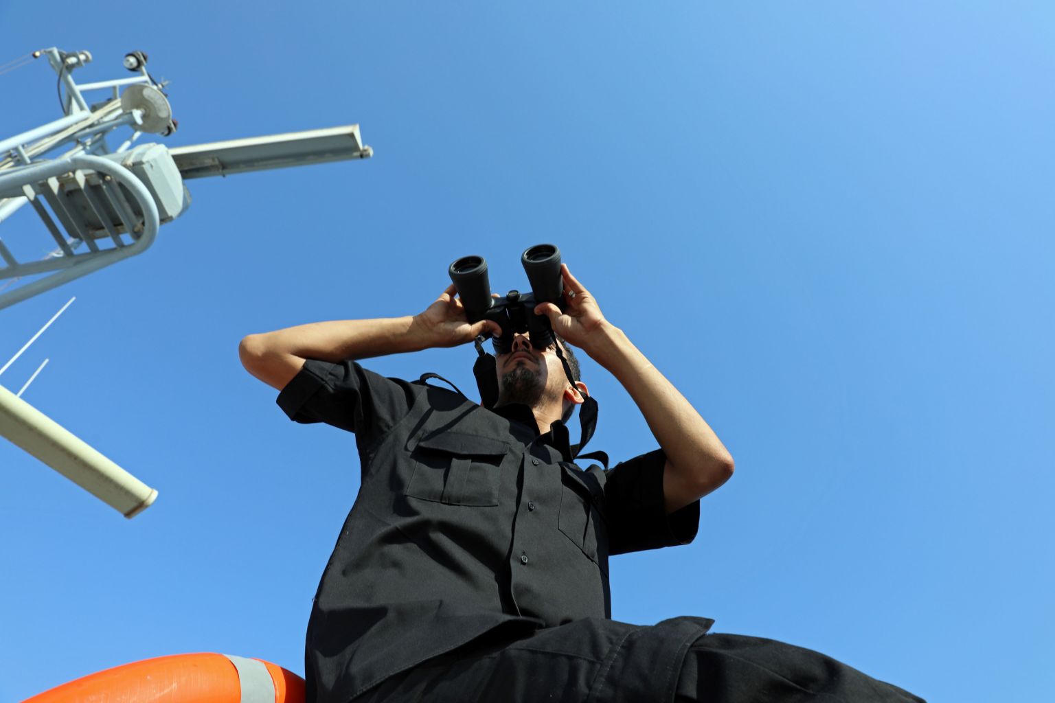 A member of the Libyan Coast Guard searches for migrants off the coast of Tripoli.