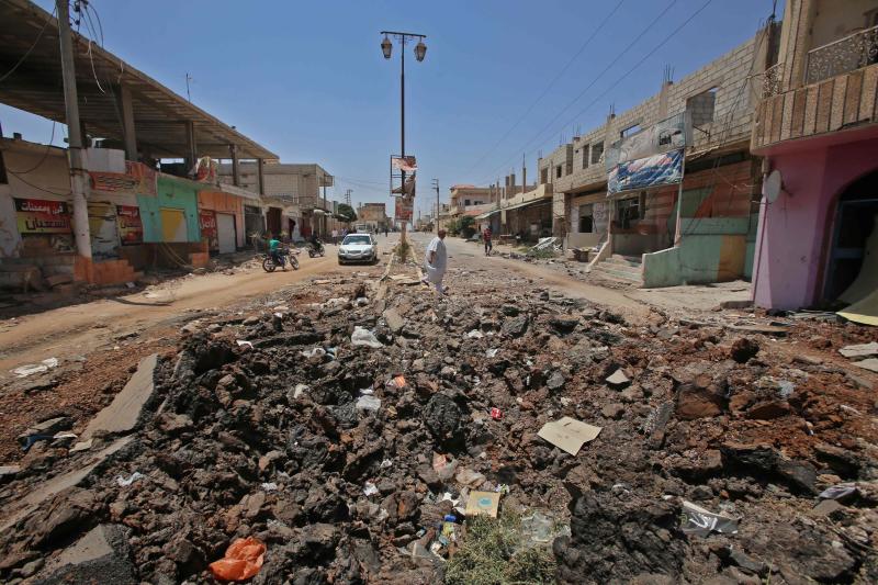 A Syrian civilian walks past a shell hole after Syrian government forces recently recaptured the village of Ghariyah ash Sharqiyah from the rebels, in the province of Deraa, on July 4, 2018.
