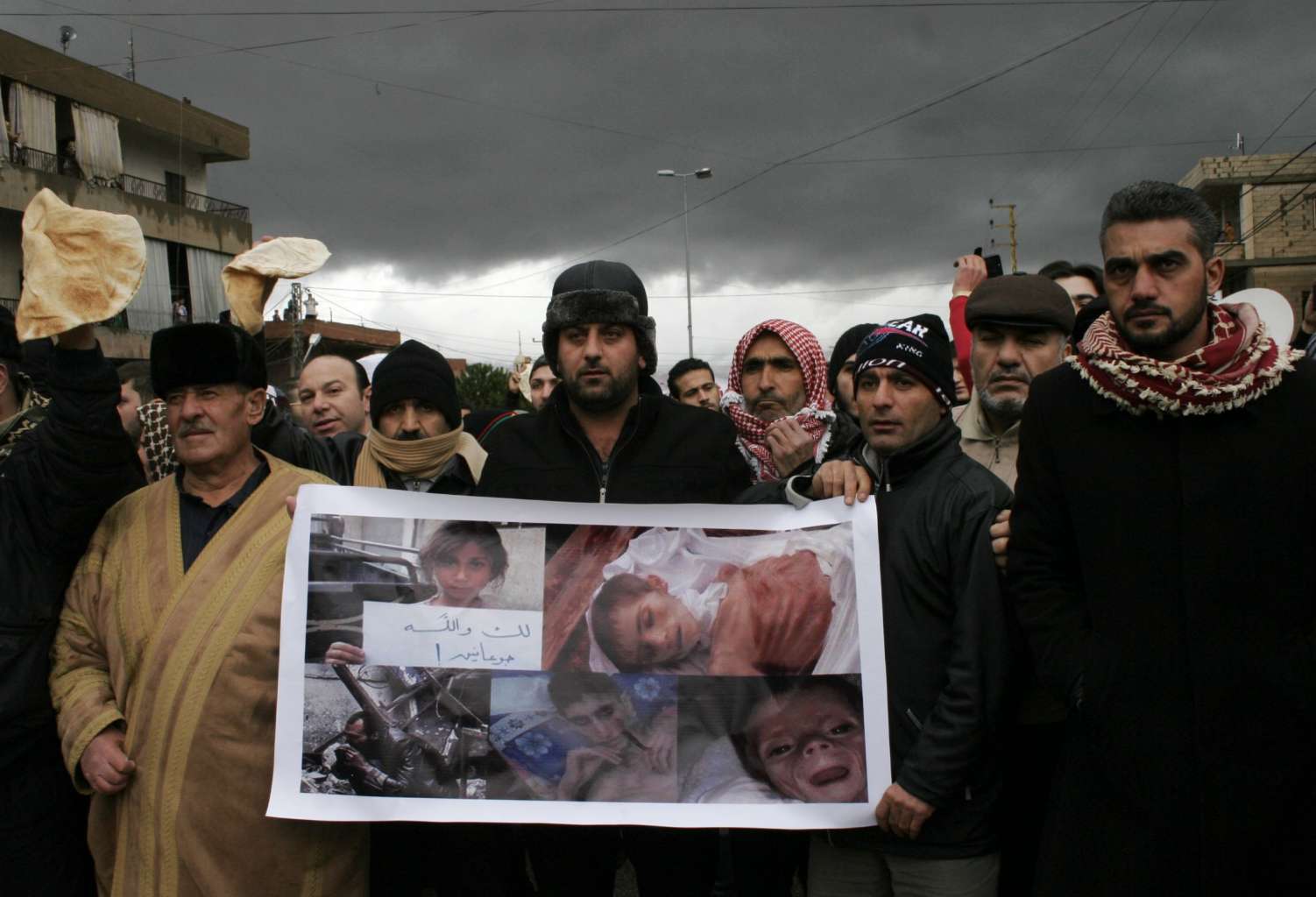 Lebanese protesting against the ongoing siege imposed on the Syrian town of Madaya, at the Masnaa crossing on the Lebanon-Syria border on Jan 8, 2016.