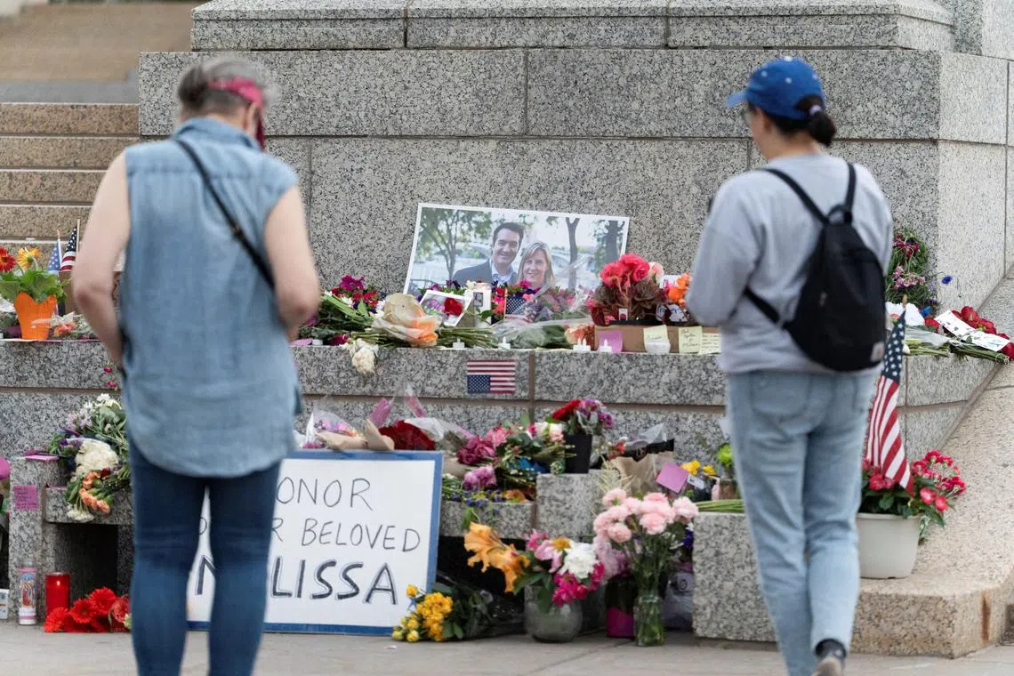 People visit a memorial outside the Minnesota State Capitol in honour of Democratic state representative Melissa Hortman and her husband Mark on June 15.