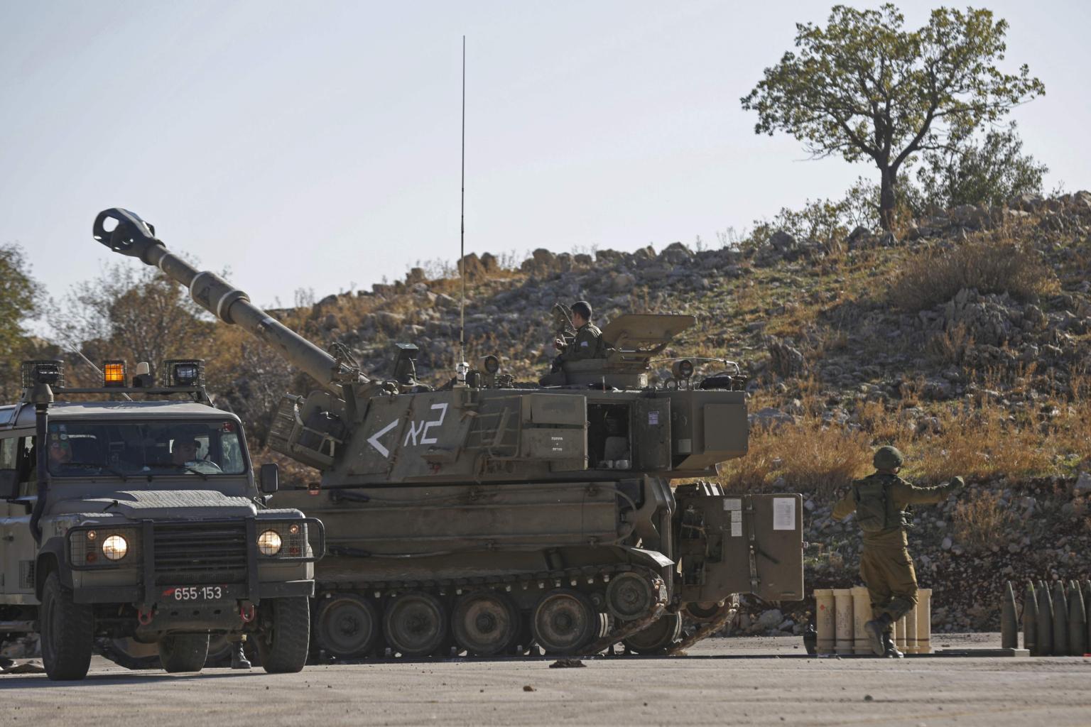An Israeli M109 self-propelled howitzer is stationed near the border with Syria in Golan Heights on Nov 19, 2019. Israel sometimes launches its attacks on Syria from planes.
